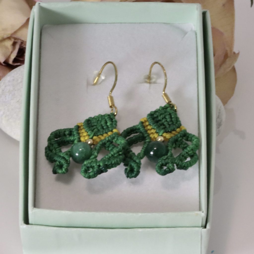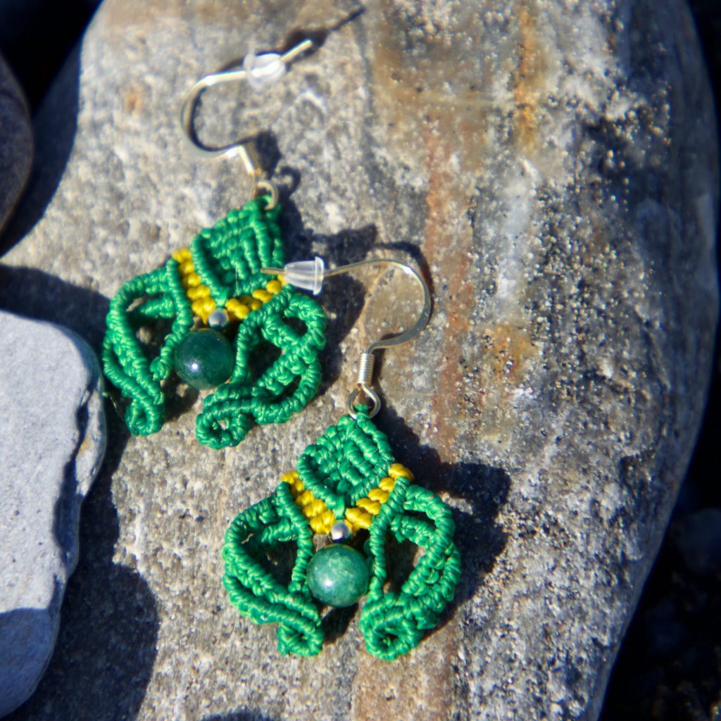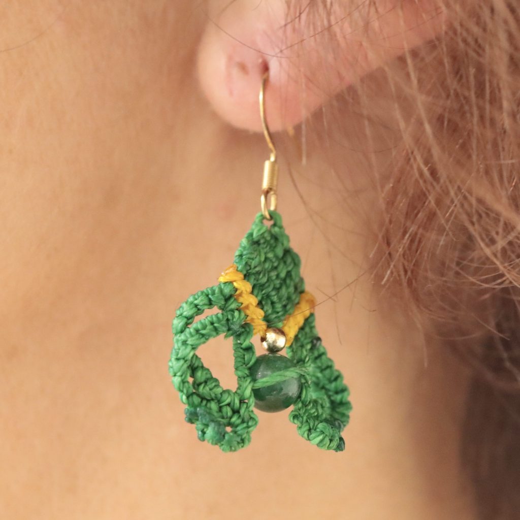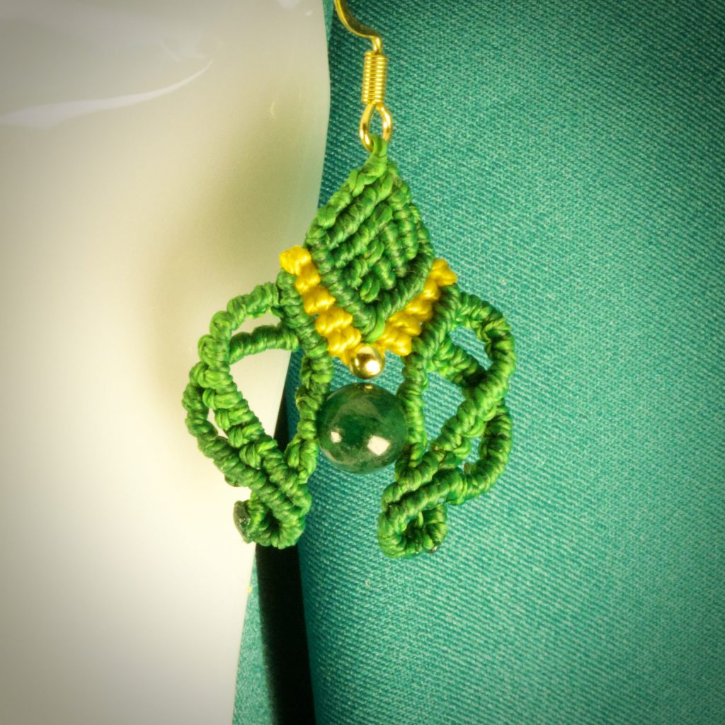 Le micro-macramé vert, minutieusement tissé, forme un écusson végétal, rappelant la force et la sérénité des forêts profondes. Une fine ligne verticale jaune apporte une touche de lumière, comme un rayon de soleil perçant à travers les arbres. Des entrelacs de lianes délicats viennent encadrer une perle d’émeraude de 6 mm, symbole intemporel de la sérénité et du chic, surmontée d’une petite perle en laiton plaquée or 18K pour un éclat subtil.