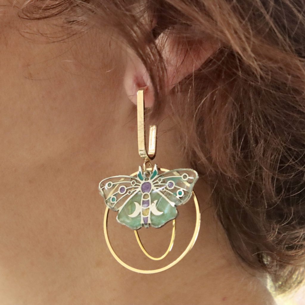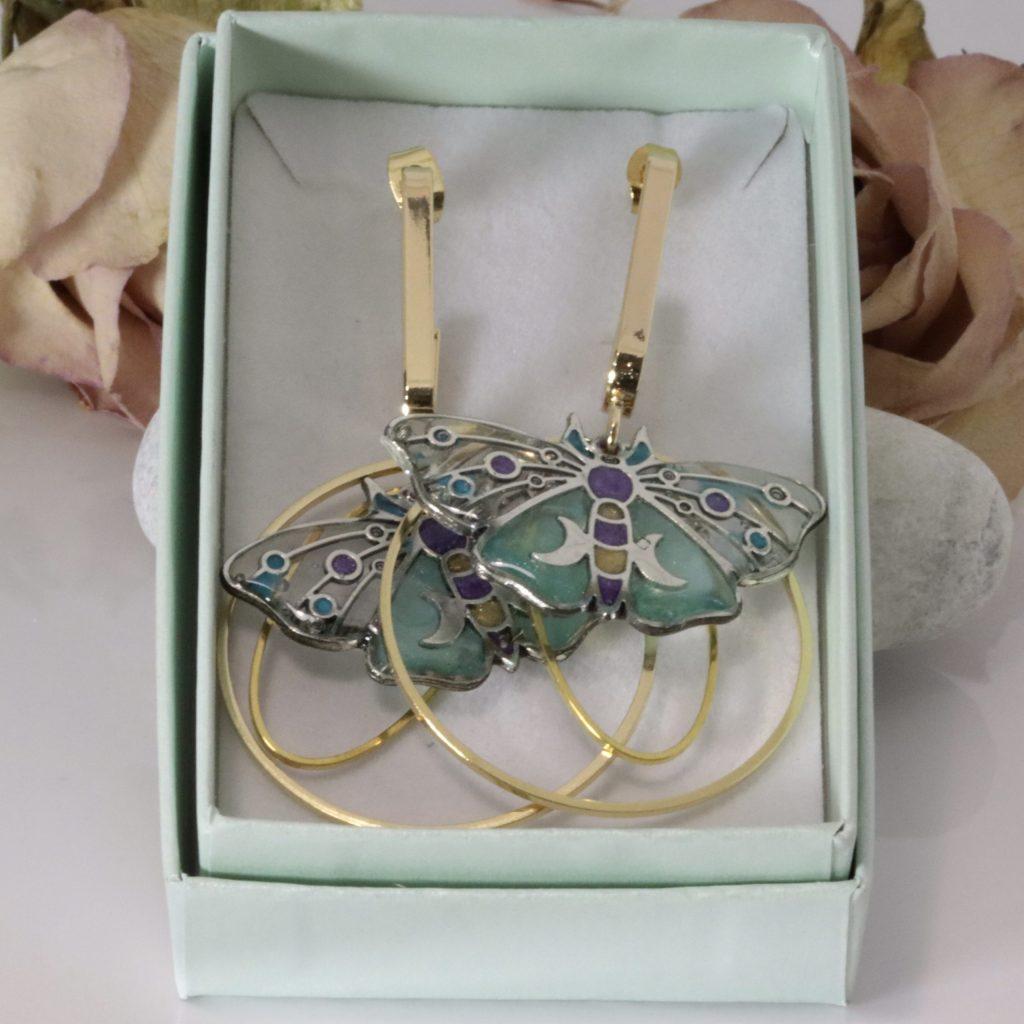 Embarque pour un voyage au cœur de la nature avec ces boucles d’oreilles papillon, où l’artisanat rencontre la poésie. Chaque papillon, minutieusement recouvert de résine colorée, présente des nuances vibrantes de bleu, de violet, et d’or, évoquant la richesse de la flore et la beauté changeante des jardins enchantés. Suspendus à des crochets en or 18K, ces papillons reposent délicatement sur des charms en forme de cercle plaqué or 24k ou d’anneau ovale, symbolisant à la fois la perfection et le cycle de la vie.