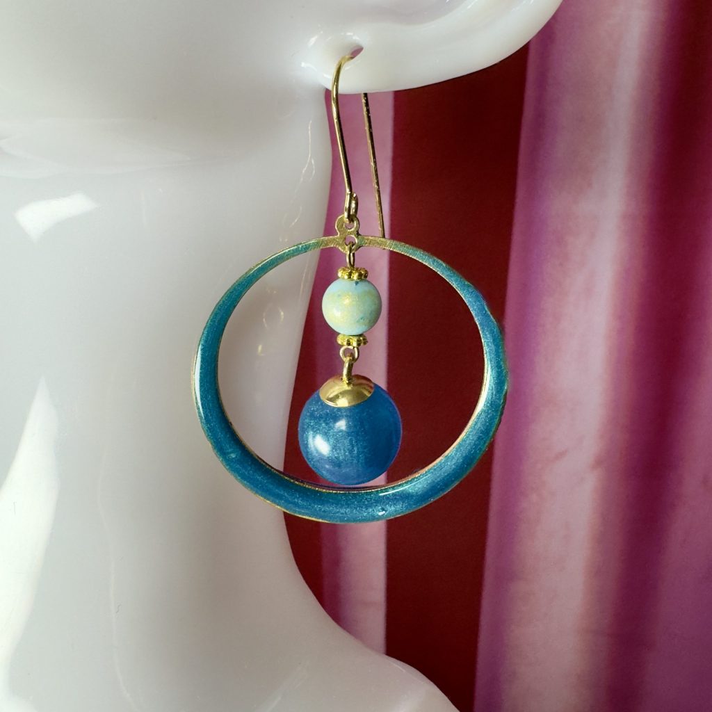– À l’intérieur du cercle : une perle de jade mashan bleu ciel, suspendue à une perle en résine bleu métallique plus foncée, pour un effet de profondeur scintillant