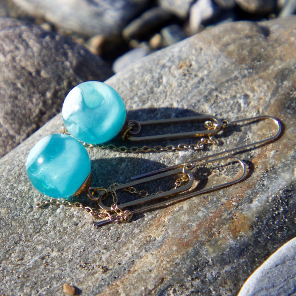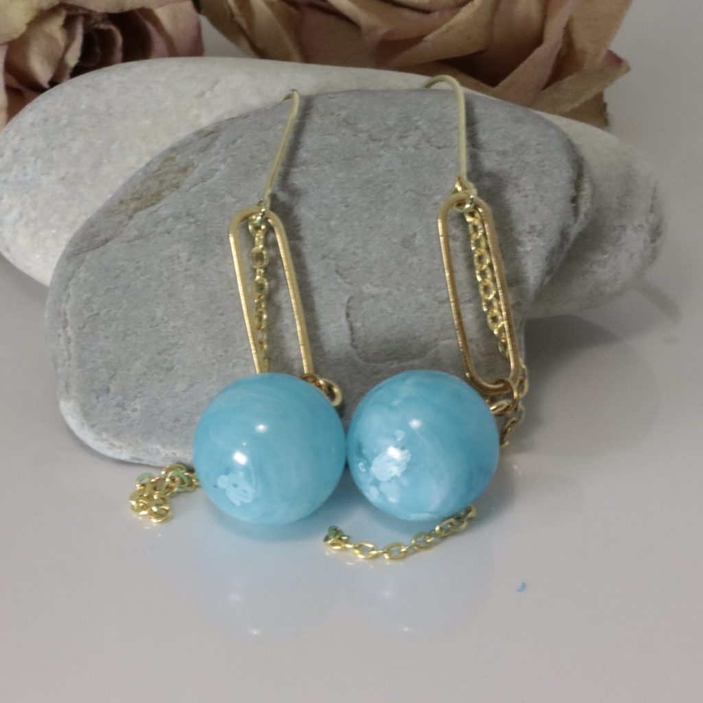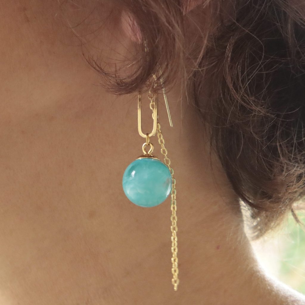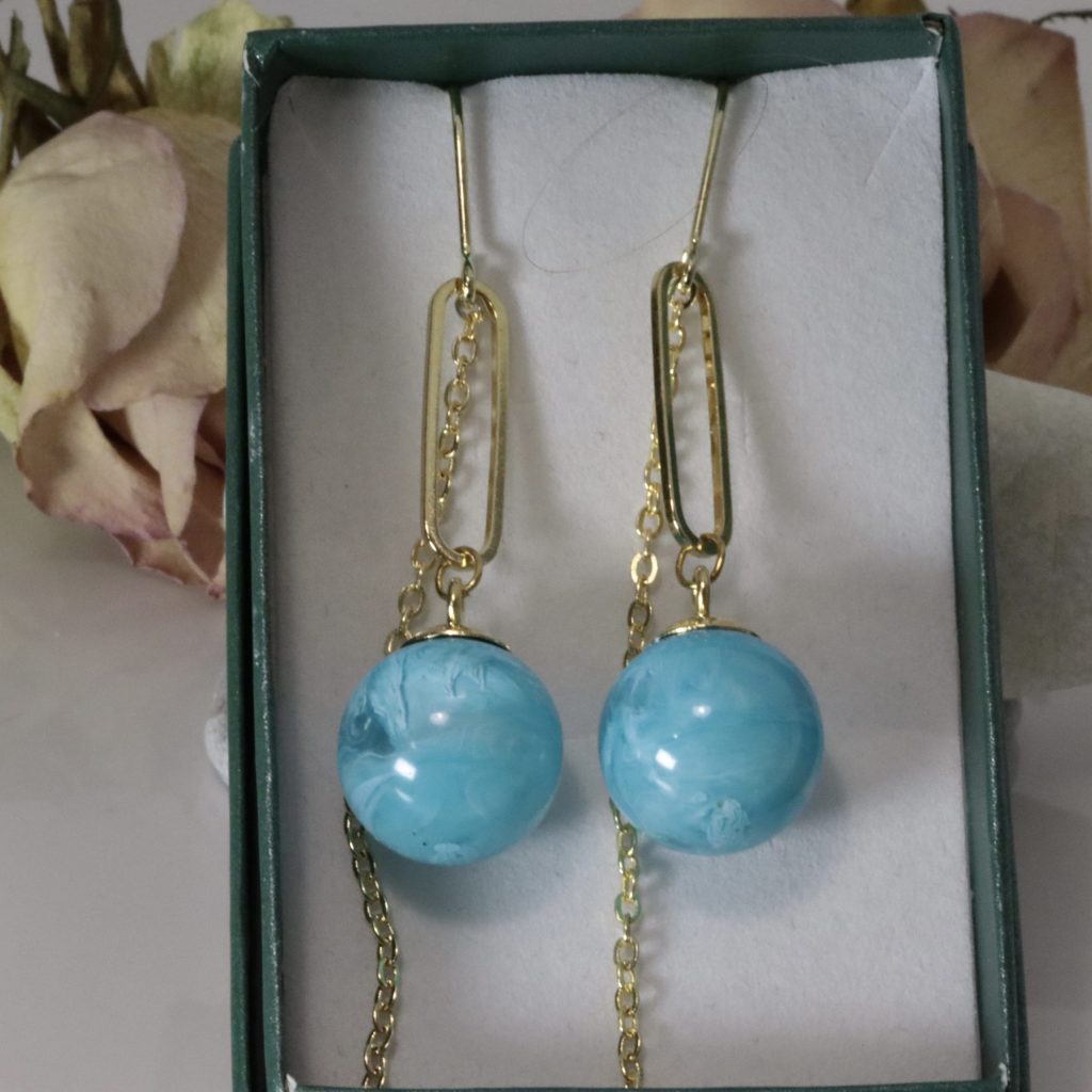 Plonge dans un univers de raffinement et de modernité avec ces boucles d’oreilles pendantes en résine bleu ciel. Chacune d’elles révèle un jeu subtil de filaments délicats à l’intérieur d’une sphère en résine, évoquant un ciel d’été traversé par des nuages éthérés. Cette sphère unique est montée sur une chaîne fine, qui lui confère un mouvement élégant à chaque pas, tandis qu’un crochet d’oreilles et un anneau plaqués or viennent compléter l’ensemble avec sophistication.
