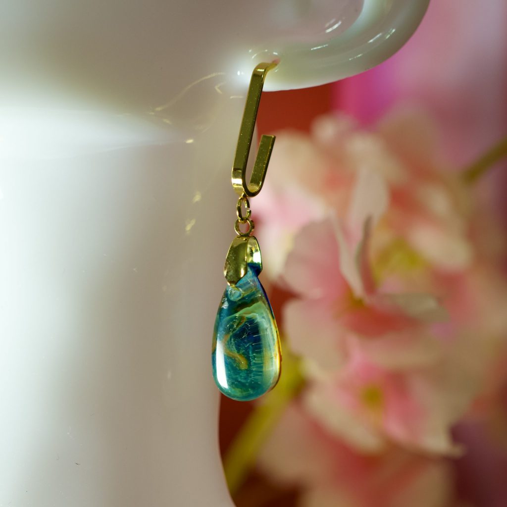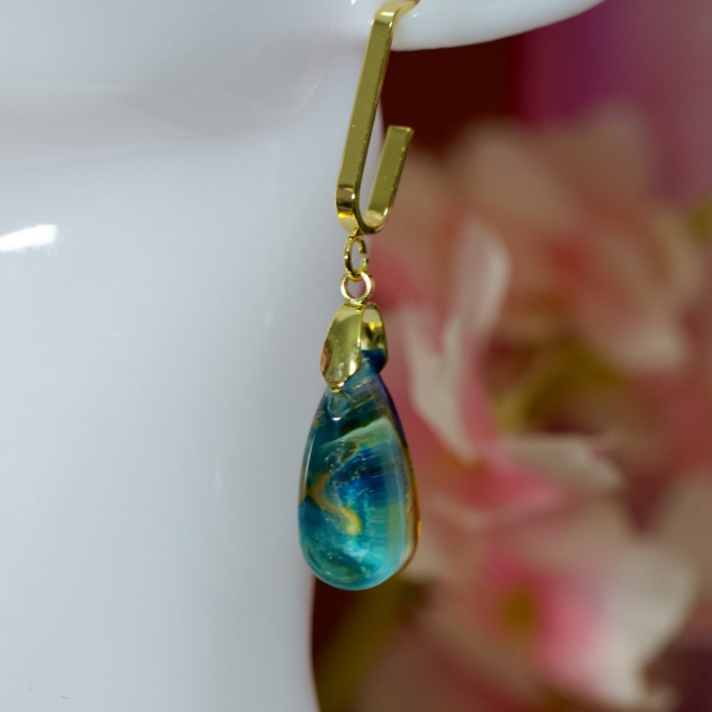 Ces boucles d’oreilles pendantes en résine capturent la profondeur du ciel étoilé dans une goutte de 6 cm, suspendue à un crochet d’oreille plaqué or. Chaque pièce est unique : un savant mélange de bleu profond, de bleu marine, de vert galactique, le tout parcouru de filaments dorés qui rappellent les constellations ou la voie lactée.