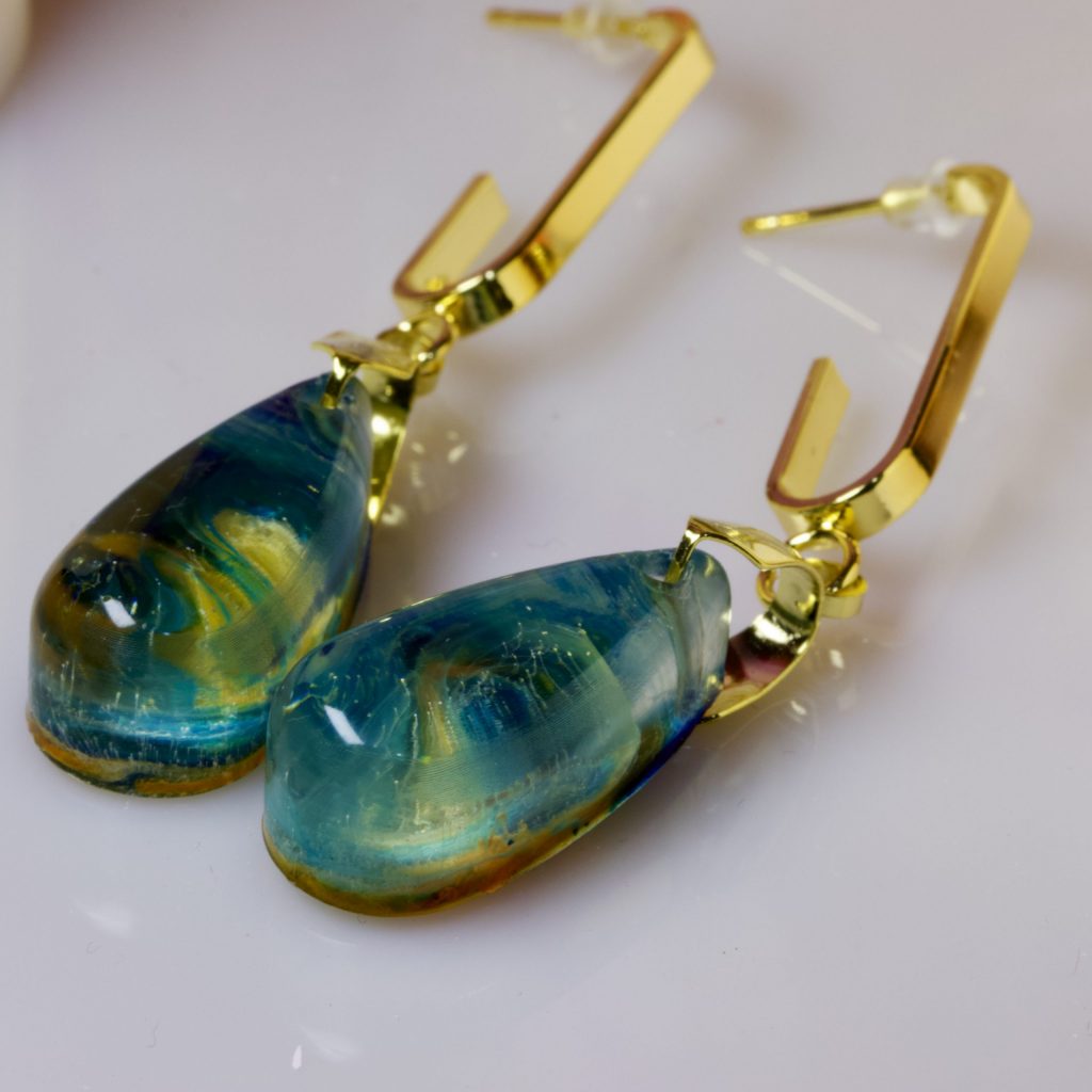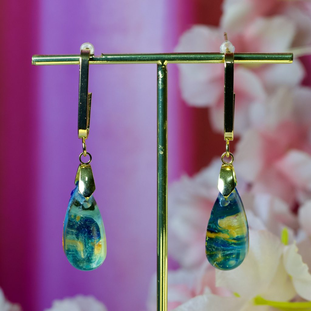 Boucles d’oreilles pendantes en résine – Goutte cosmique de 6 cm aux couleurs de l’univers – Crochets plaqué or 🌌💫🌿