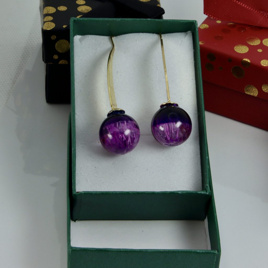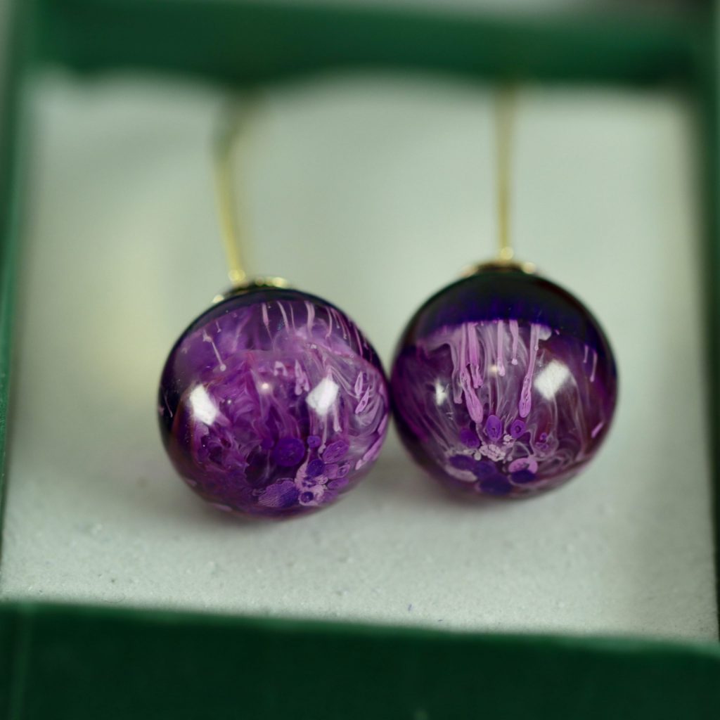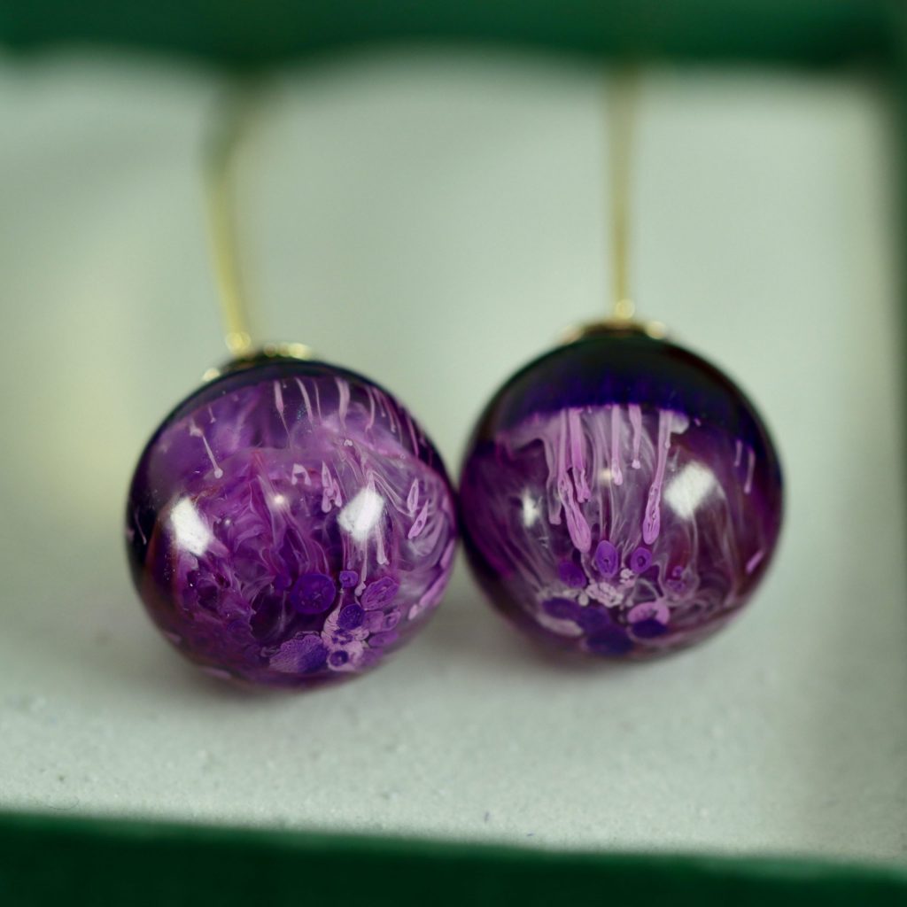 Pièces uniques : La résine violette à filaments forme des motifs toujours différents, faisant de chaque paire de boucles d’oreilles une création exclusive.