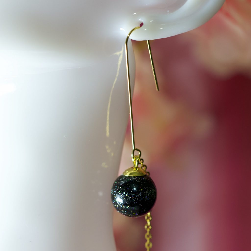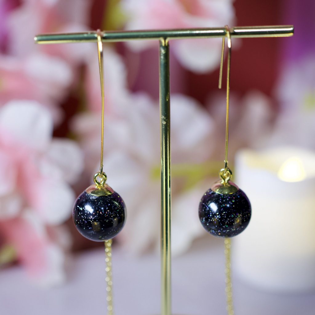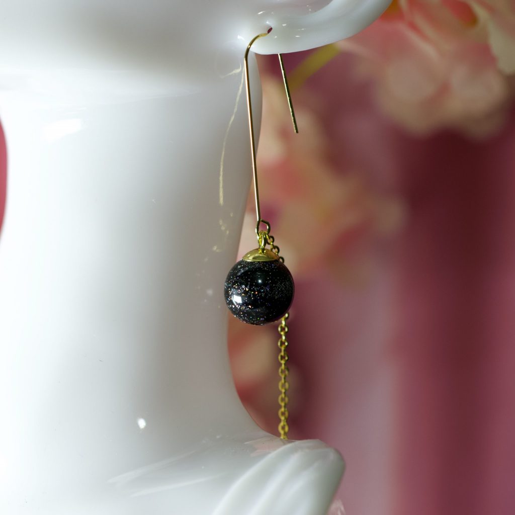 Ces boucles d’oreilles pendantes en résine noire sont ponctuées de paillettes roses incrustées, comme autant d’étoiles dans la nuit. Suspendues à un crochet long plaqué or, elles sont prolongées par une chaîne dorée fine, qui danse à chaque mouvement. Longueur totale : 6 cm.