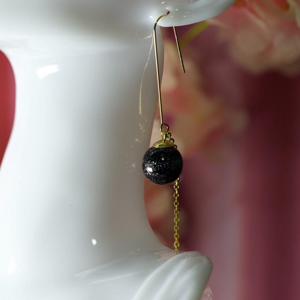 🖤 Imagine… Tu entres dans la pièce, et la lumière effleure les reflets dorés de la chaîne. Au bout, une sphère noire parsemée de rose attire discrètement les regards. Elle évoque la nuit, la profondeur, la féminité assumée. Ces boucles sont ton talisman : intemporelles, puissantes, sensibles. Elles racontent une femme qui ne crie pas mais qui brille avec intention.