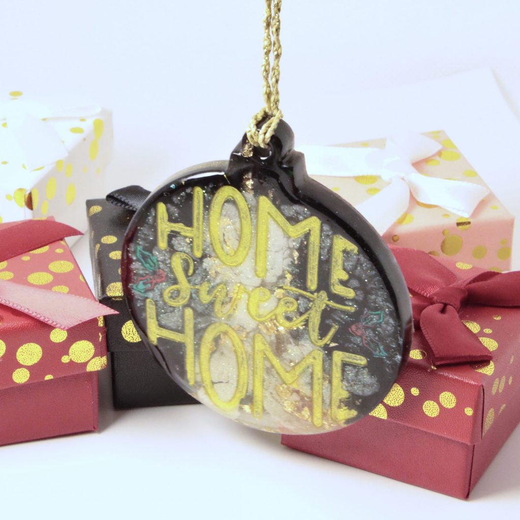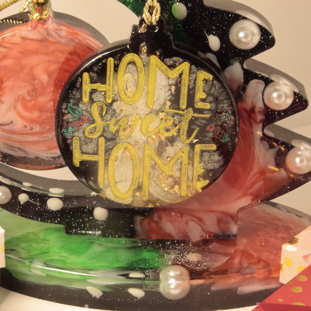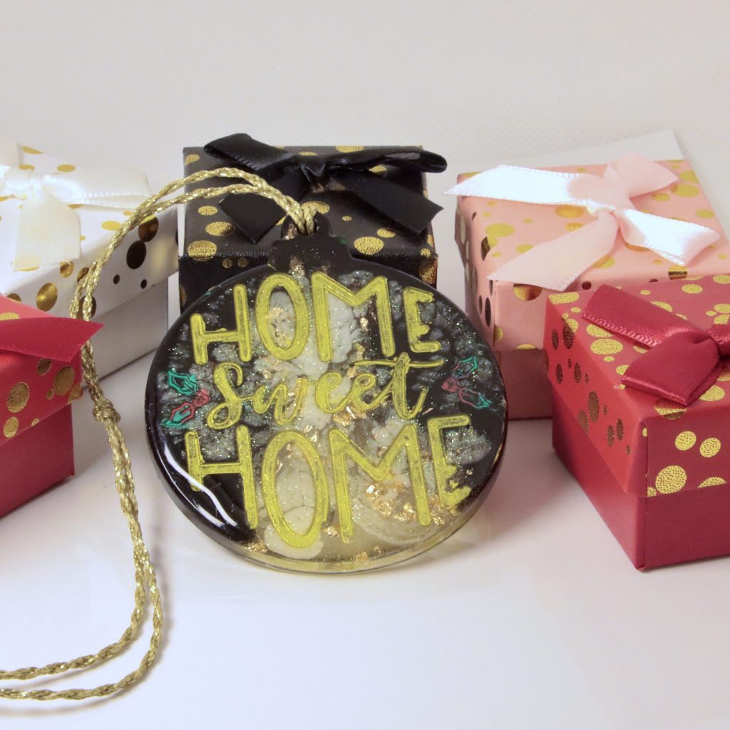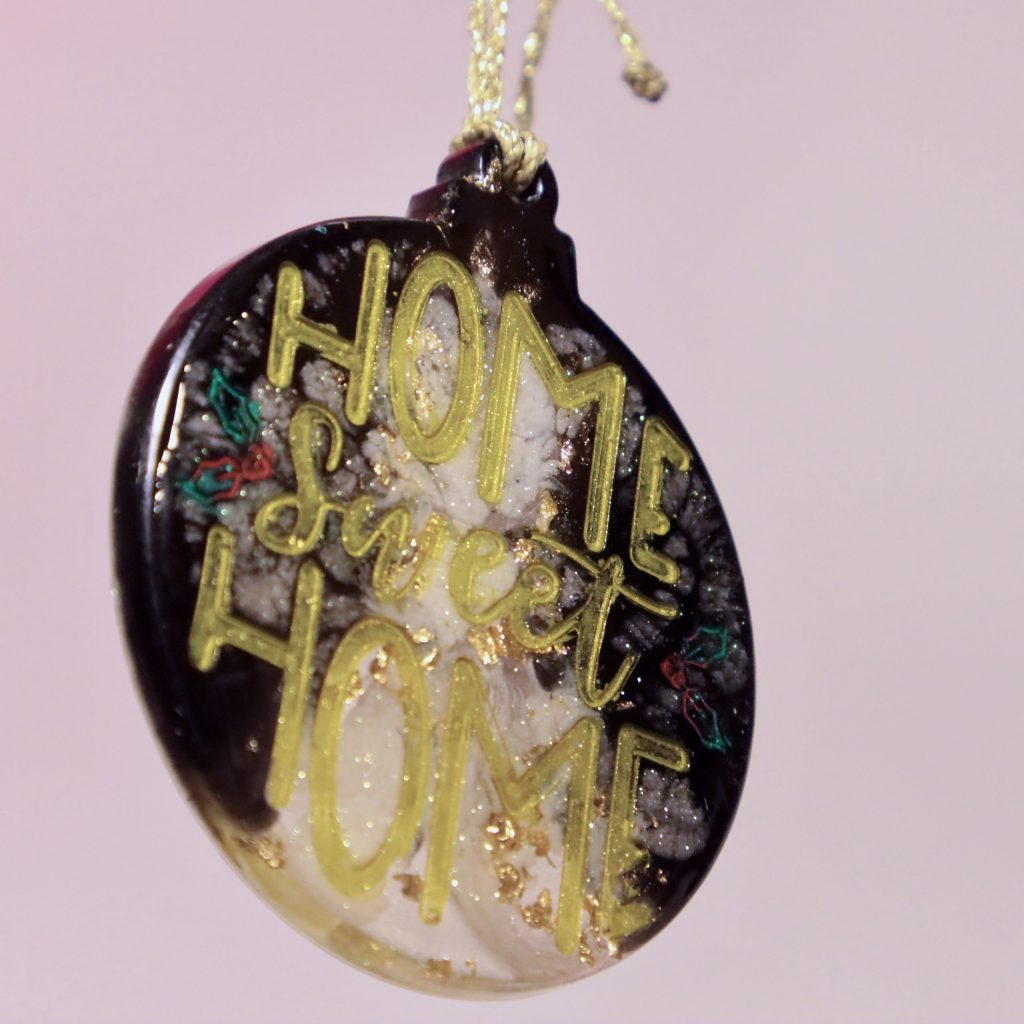 Entre dans un cocon de sérénité et de magie avec cette boule de Noël en résine noire, parsemée de paillettes blanches qui rappellent les flocons d’un hiver féerique. L’inscription dorée “Home Sweet Home“, peinte à la main avec amour, évoque la chaleur d’un foyer rempli d’amour et de lumière.