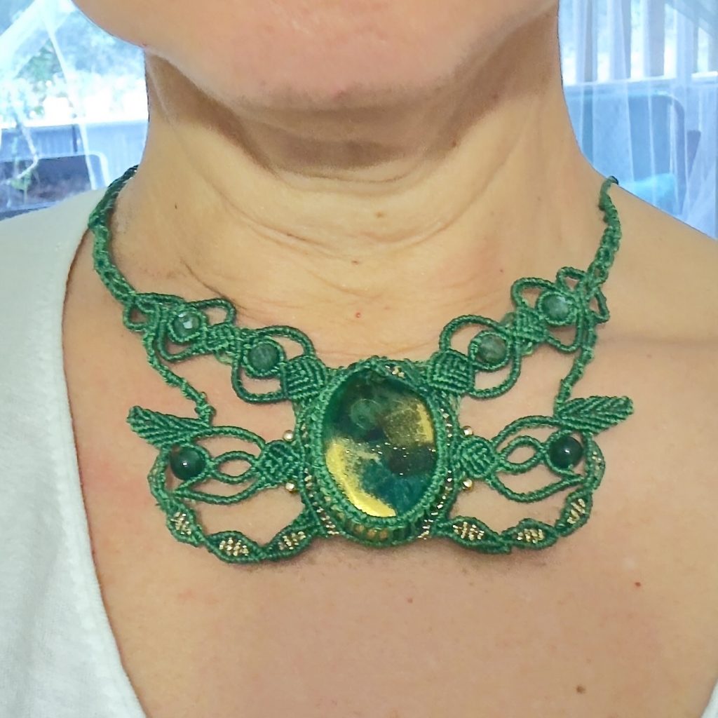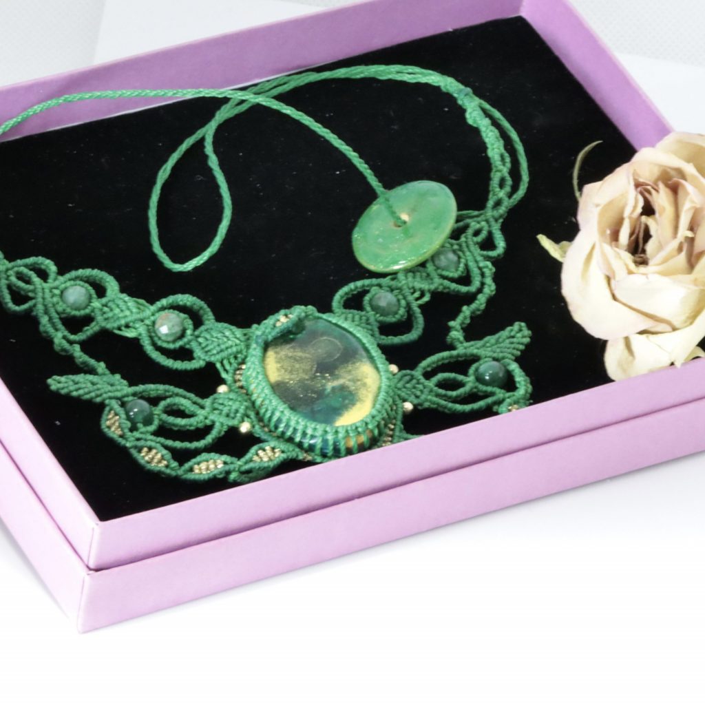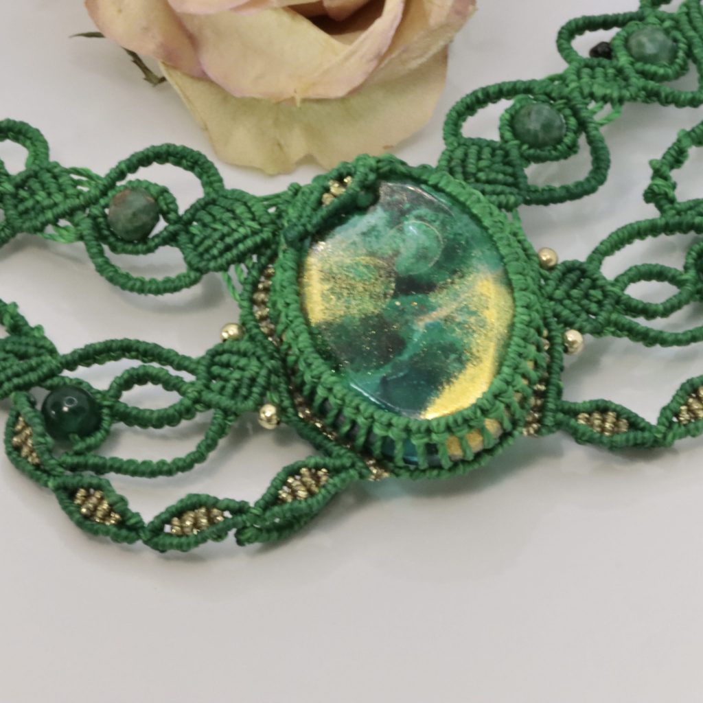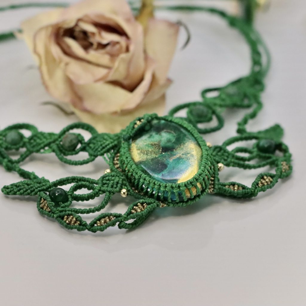 Ce collier en résine et micro-macramé t’invite à un voyage au cœur de l’élégance naturelle et de l’énergie positive. Au centre, un cabochon en résine vert émeraude de 3,5 cm sur 2,5 cm, délicatement rehaussé de touches dorées pour une allure à la fois mystique et raffinée. Ce cabochon en forme ovale est entouré d’un sertissage en micro-macramé d’une finesse incomparable, dans des tons émeraude et doré, qui évoquent des lianes, des pétales et des feuilles qui semblent prendre vie autour de ton cou.