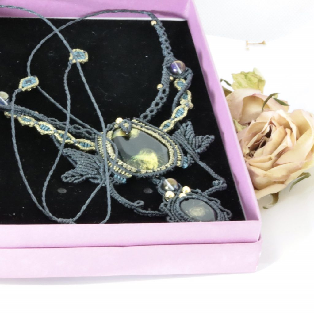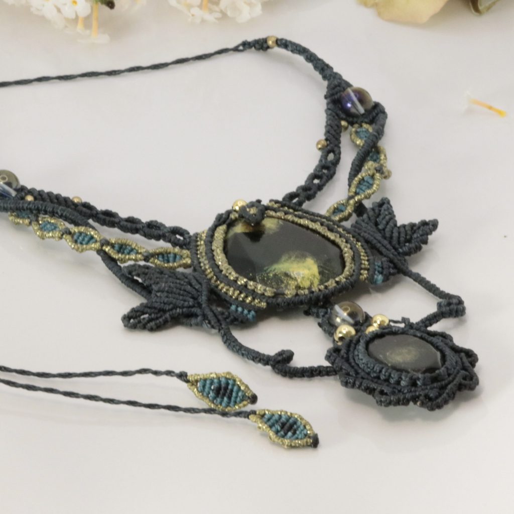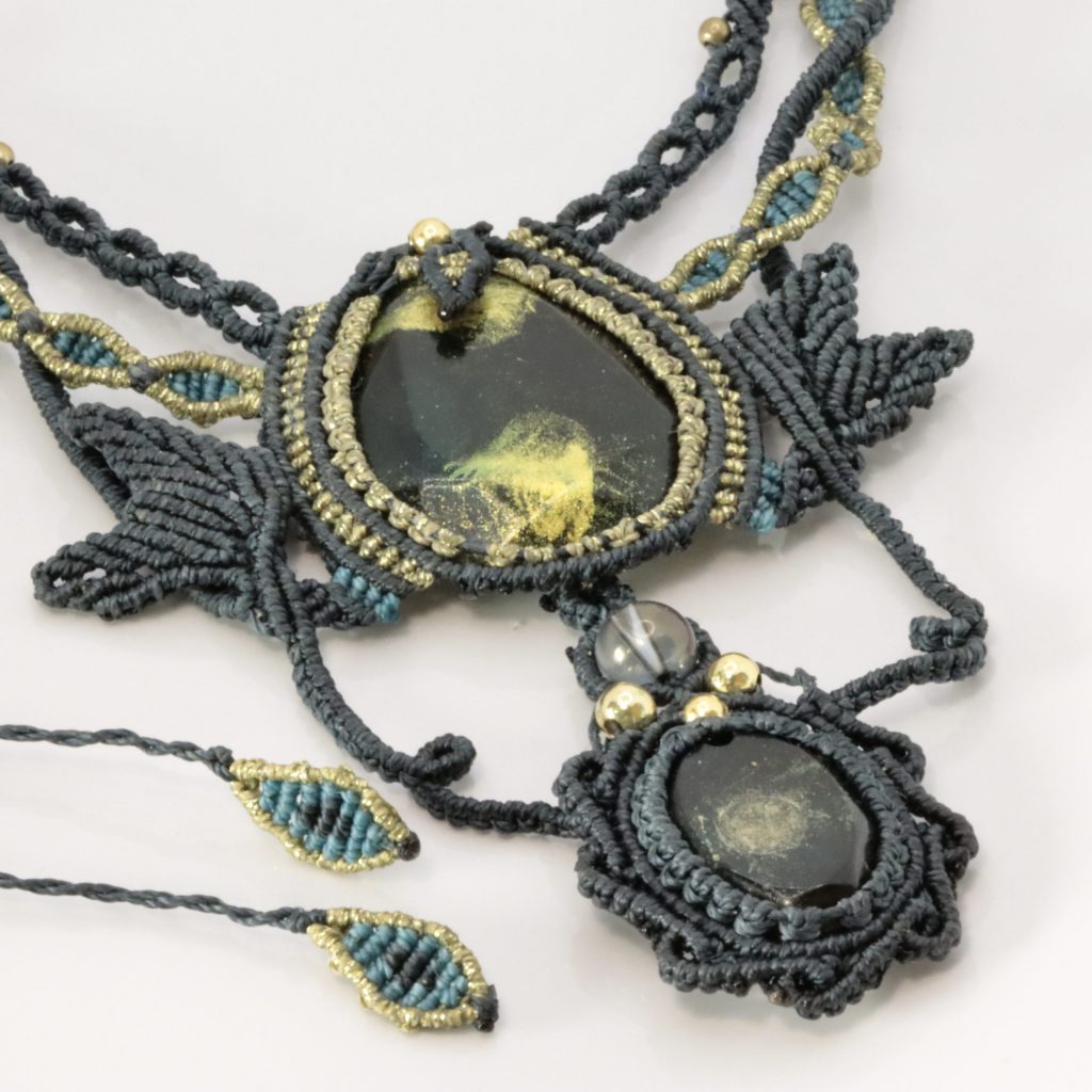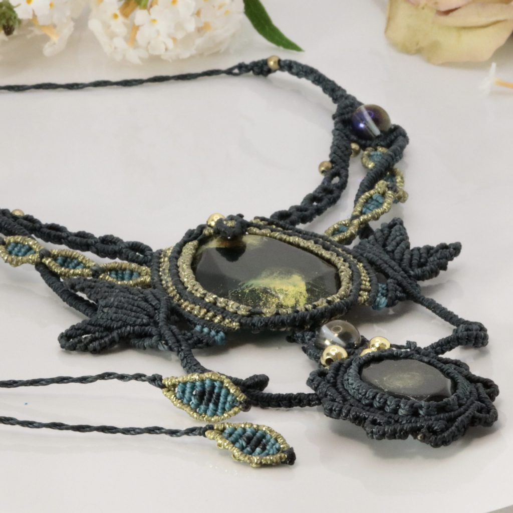 Laissez-vous envoûter par ce collier en résine et micro-macramé, où deux cabochons bleu orage se mêlent à des perles d’Aqua aura et de laiton plaqué or. Un bijou unique qui incarne l’élégance et le mystère.