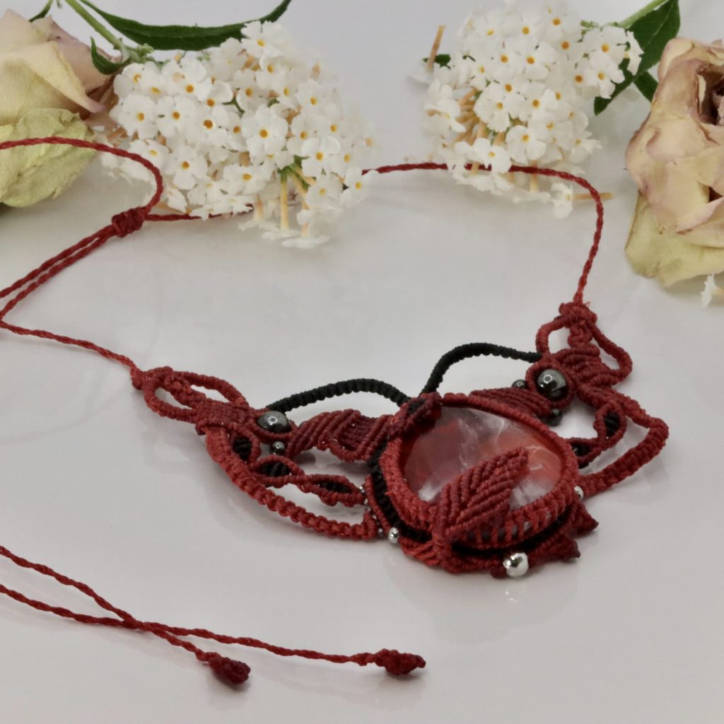 Autour du cabochon, des perles d’hématite s’illuminent dans le tissage, telles des étoiles perdues dans la nuit écarlate. Ces petites gemmes métalliques capturent la lumière et offrent à ce collier une brillance discrète, mais inoubliable. Leur présence semble insuffler une énergie mystérieuse, une force presque magique qui protège et apaise celle qui porte ce bijou.