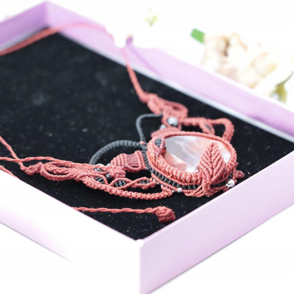 Le travail minutieux du micro-macramé bordeaux et noir apporte une touche de profondeur et de mystère supplémentaire. Le rouge flamboyant se mêle au noir velouté, créant un contraste saisissant, comme une danse entre l’ombre et la lumière. C’est ce jeu de couleurs, cette alternance subtile de forces opposées, qui fait de ce collier une véritable œuvre d’art, à la fois féminine et mystique.