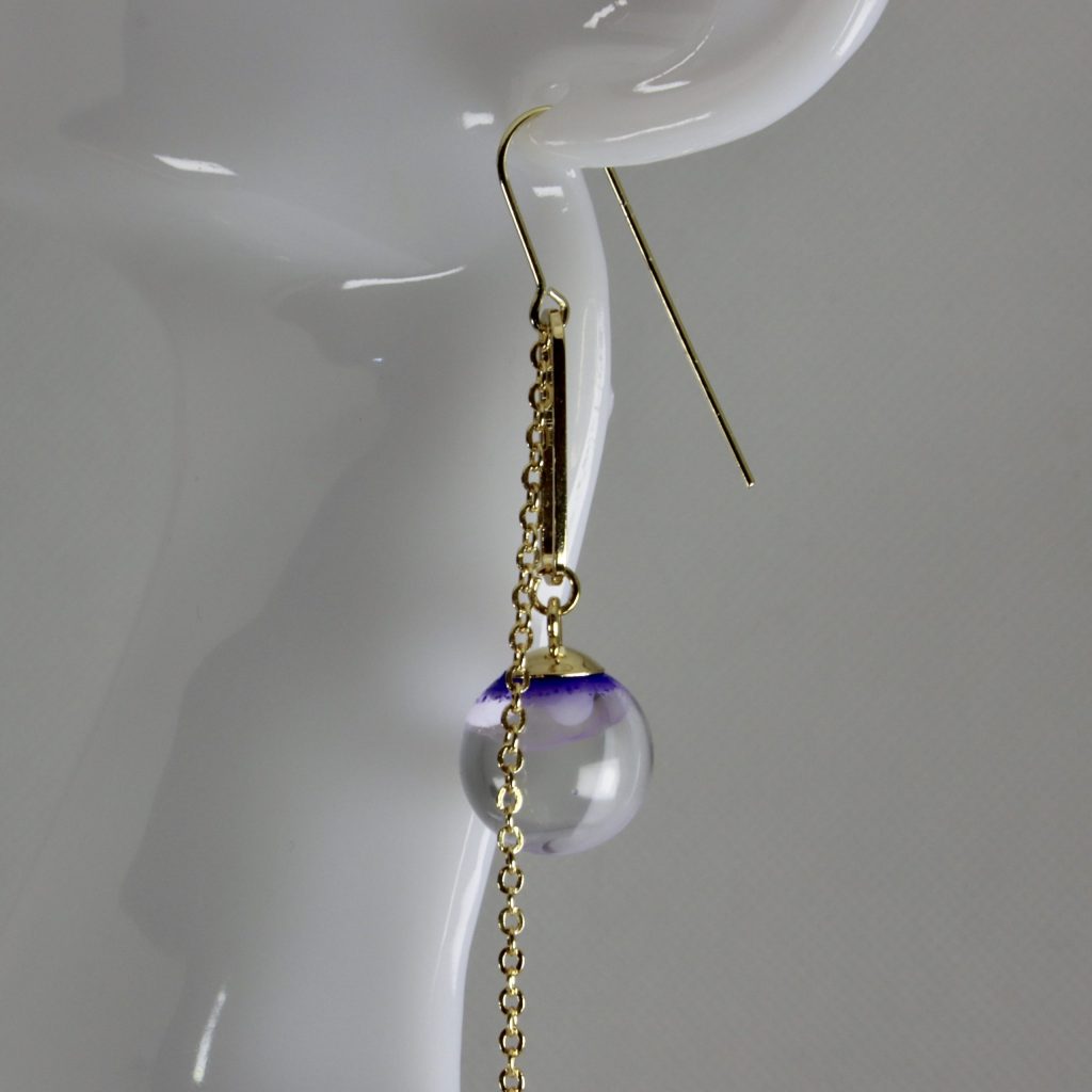 Leur design associe un long crochet d’oreille plaqué or 18k, un matériau noble et durable, à un connecteur rectangulaire finement travaillé. Suspendue en délicatesse, une sphère de résine lavande transparente, embellie d’un fascinant effet de nuage, captive par sa douceur visuelle. Une chaîne dorée d’environ 7 cm vient ajouter une touche de mouvement et de fluidité à l’ensemble.