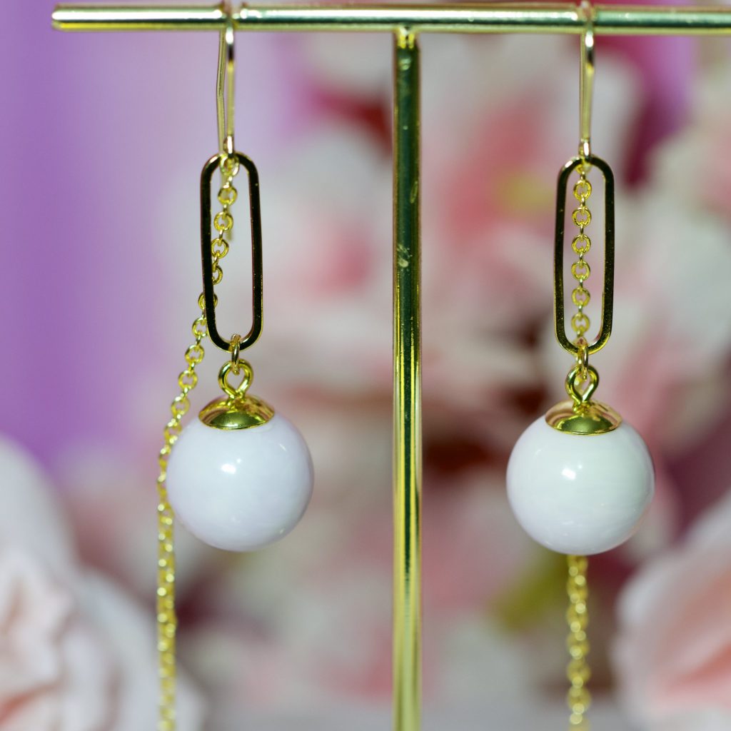 Ces pendants d’oreilles faits main marient avec délicatesse la légèreté du blanc rosé à l’éclat chaleureux du laiton doré. Chaque paire est composée d’un crochet long plaqué or, d’un connecteur ovale doré de 2 cm, d’une chaîne fine dorée d’environ 7 à 8 cm, et d’une perle en résine blanc légèrement rosé, suspendue avec élégance. Une pièce intemporelle, douce et lumineuse, parfaite pour révéler ta féminité avec subtilité.
