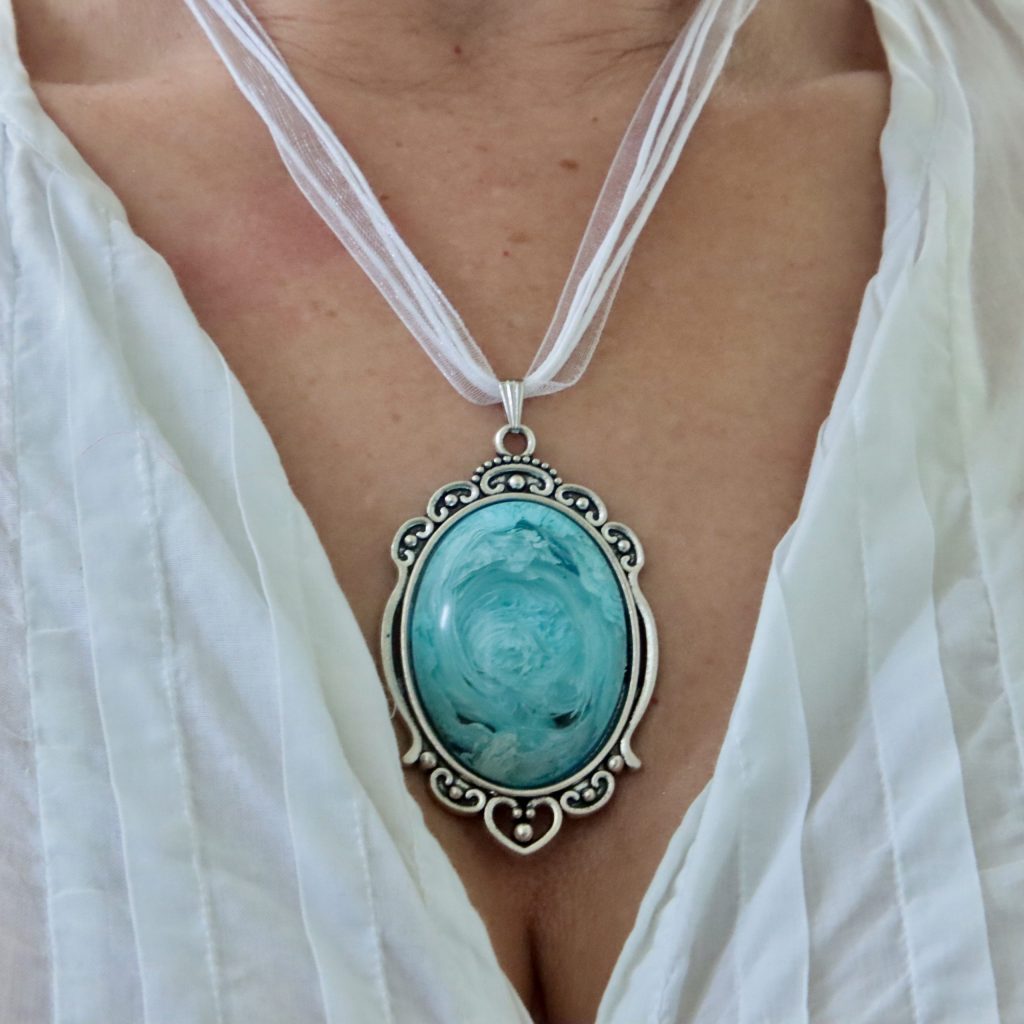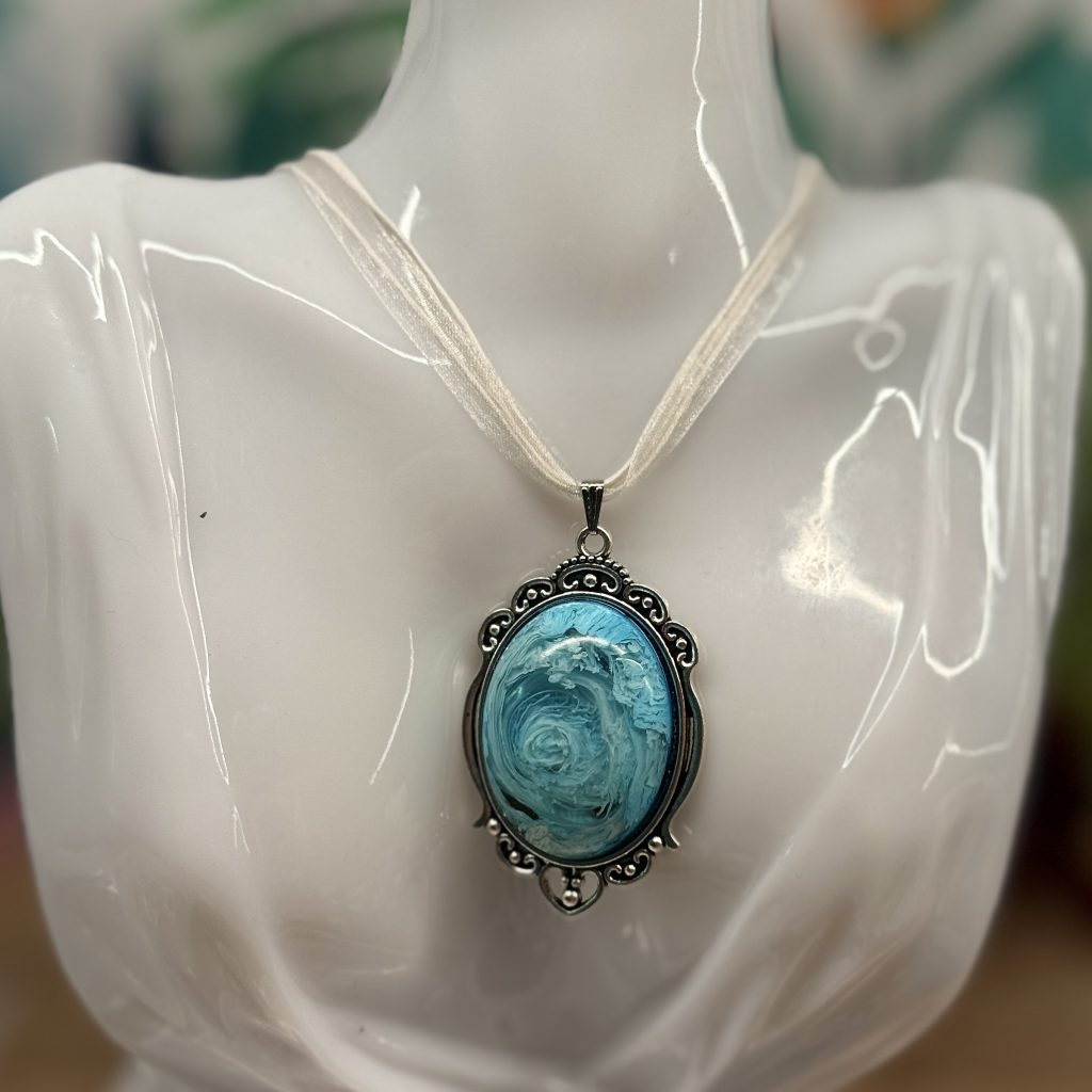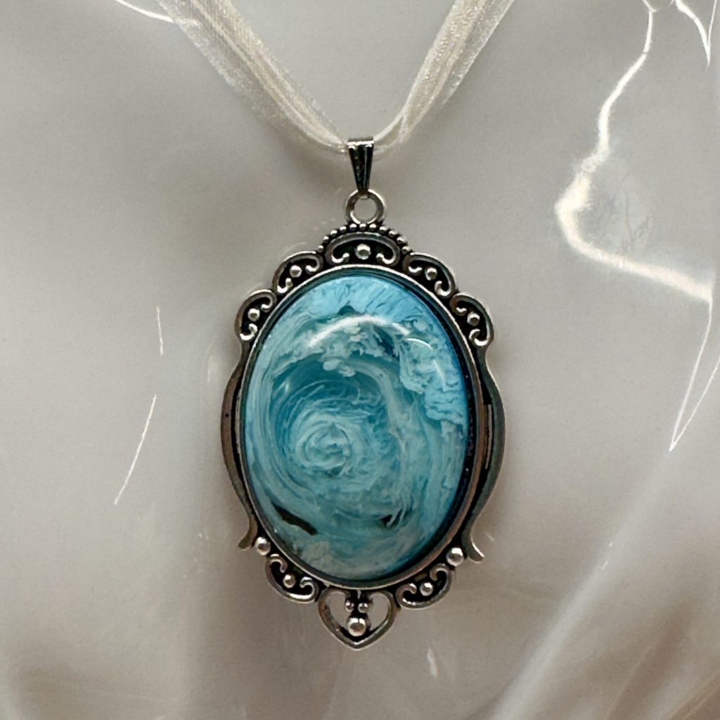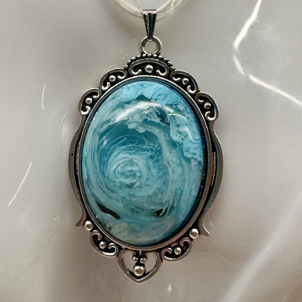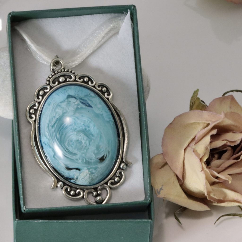Ce pendentif en résine bleu est une véritable invitation au voyage intérieur, pensé pour te reconnecter à ta douceur féminine et t’offrir un moment de réconfort. Son cabochon ovale de 40 mm sur 30 mm, sublimé par un effet Pétri délicat, dévoile des filaments de résine aux tons bleutés et blancs, comme une danse mystérieuse et apaisante au cœur de la mer. Collé sur un support en alliage argenté orné de motifs floraux, ce pendentif marie avec harmonie l’élégance intemporelle à un design unique et raffiné.