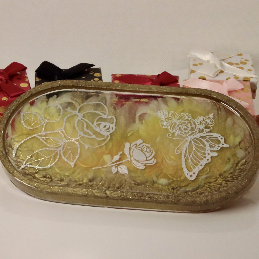 Apporte une touche de magie et d’élégance à ton intérieur avec ce porte-bijoux en résine de 17 cm de long et 9 cm de large. Ses motifs holographiques de roses et de papillon capturent la lumière sous des angles différents, créant une illusion d’une beauté mouvante et féerique. Le fond de volutes blanches et transparentes ajoute un aspect léger et aérien, tandis que les rebords dorés subliment chaque détail, offrant à ce porte-bijoux une allure chic et intemporelle.