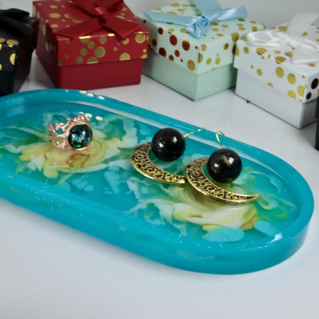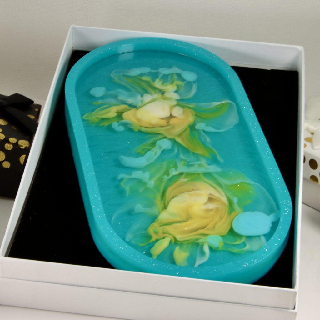 Apporte une touche de fraîcheur et de sérénité à ton espace avec ce porte-bijoux en résine rectangulaire de 17 cm de long, où l’artisanat rencontre le design. Les motifs de fleurs jaunes délicatement dessinées à la main au cœur de la résine offrent un contraste lumineux sur un fond vert azulado, évoquant un jardin baigné de soleil.