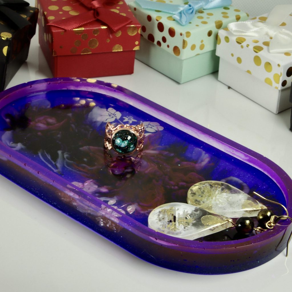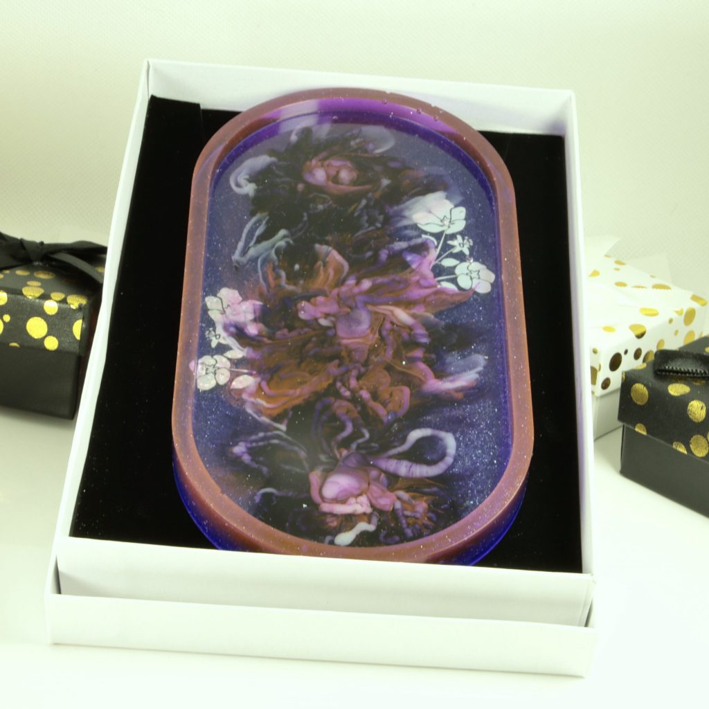 Offre à tes bijoux un écrin à leur hauteur avec ce porte-bijoux en résine rectangulaire de 17 cm de long, conçu pour capturer l’essence de la délicatesse et de l’artisanat. Les fleurs violettes dessinées à la main au cœur de la résine semblent suspendues dans un instant de grâce, tandis que les bordures violet pâle apportent une touche de douceur et de raffinement.