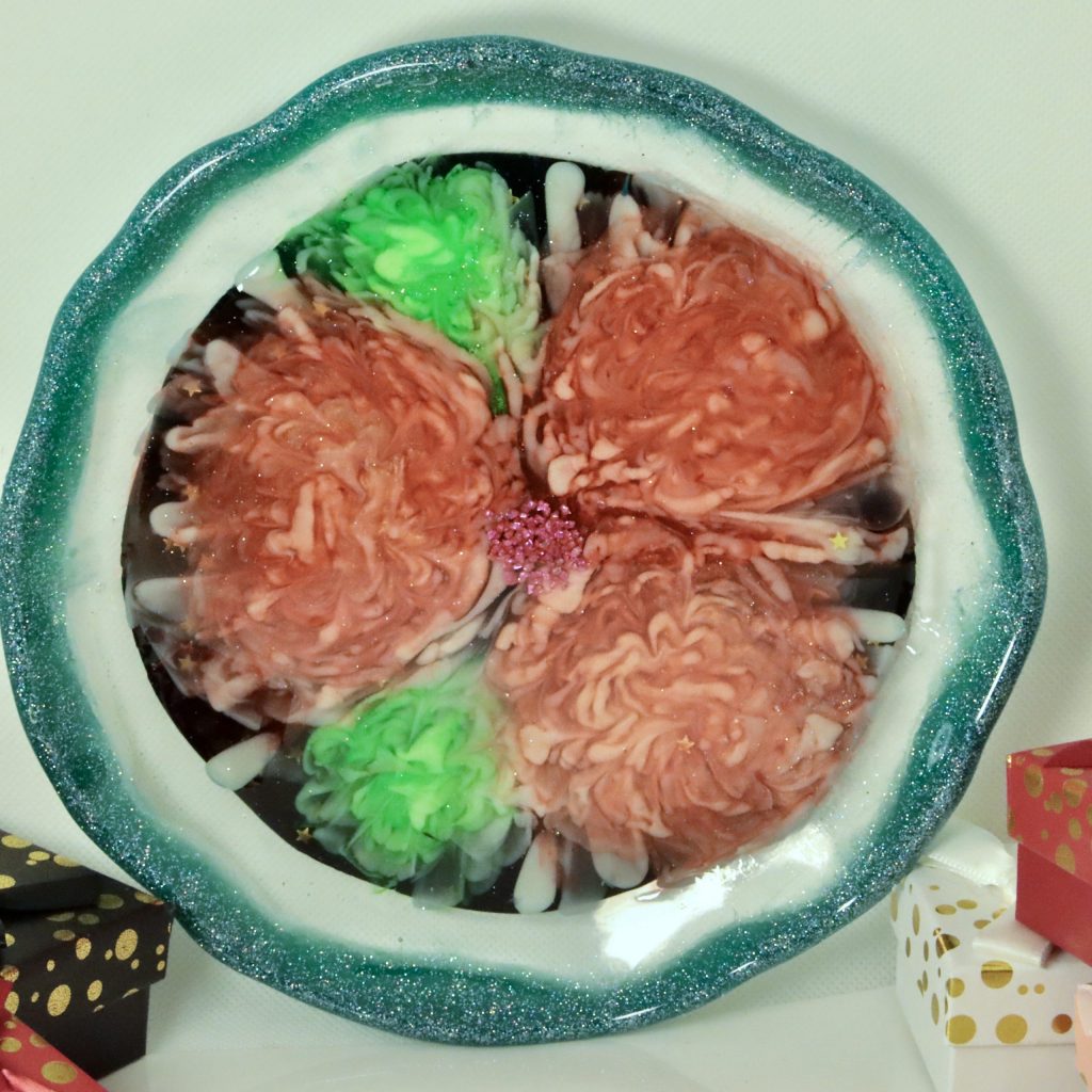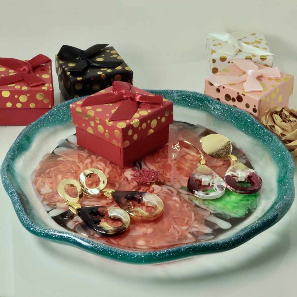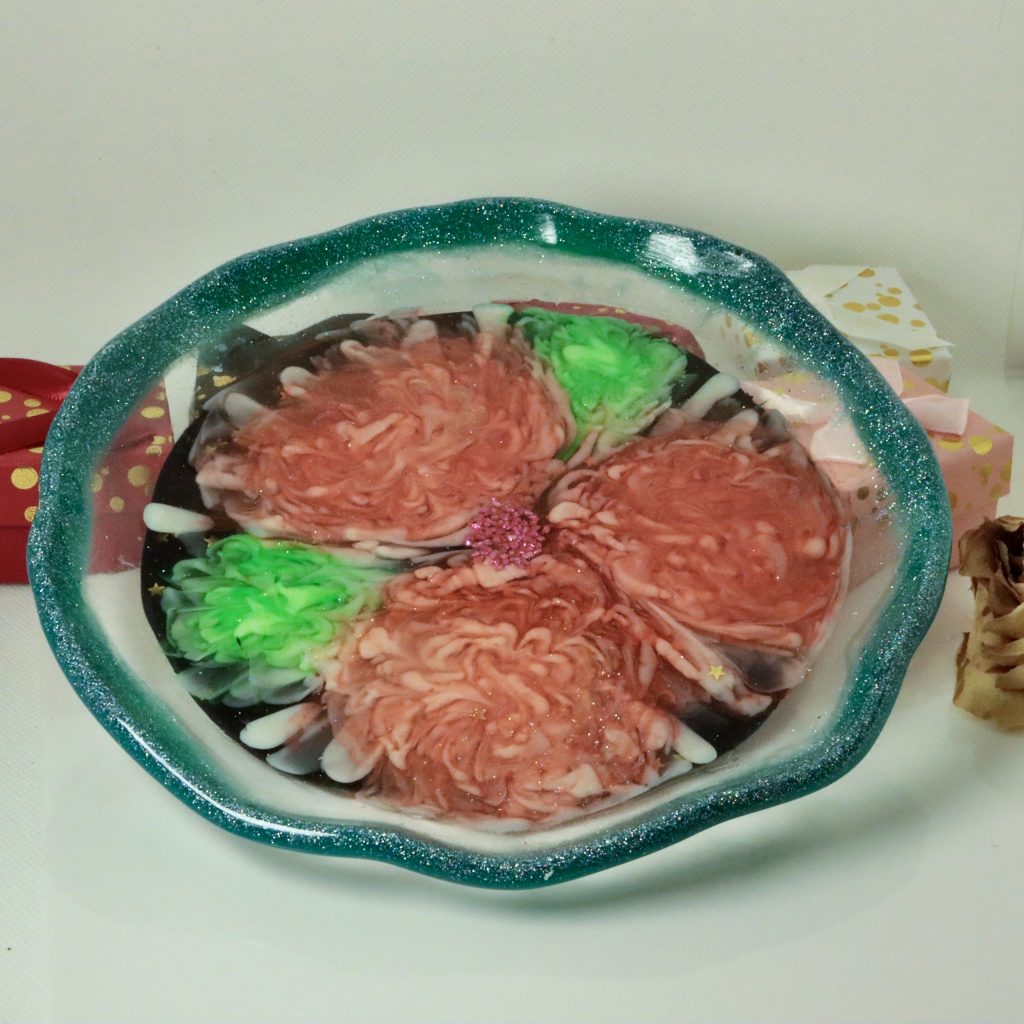 Ajoute une touche festive à ton intérieur avec ce porte-bijoux en résine, une assiette délicate ornée de pivoines rouges et vertes, parfaite pour les fêtes de Noël. Sa bordure vert azulado pailletée magnifie chaque détail pour un effet à couper le souffle.