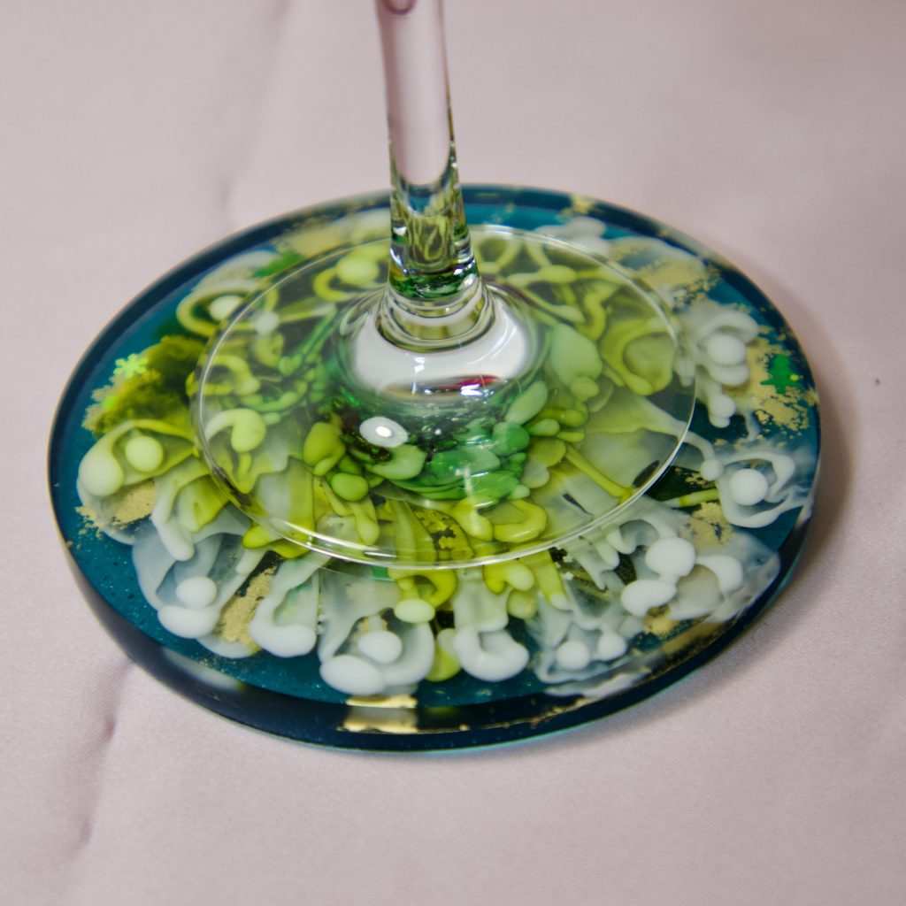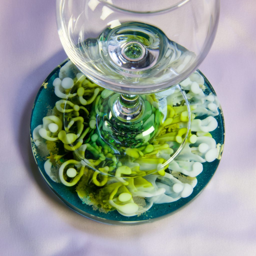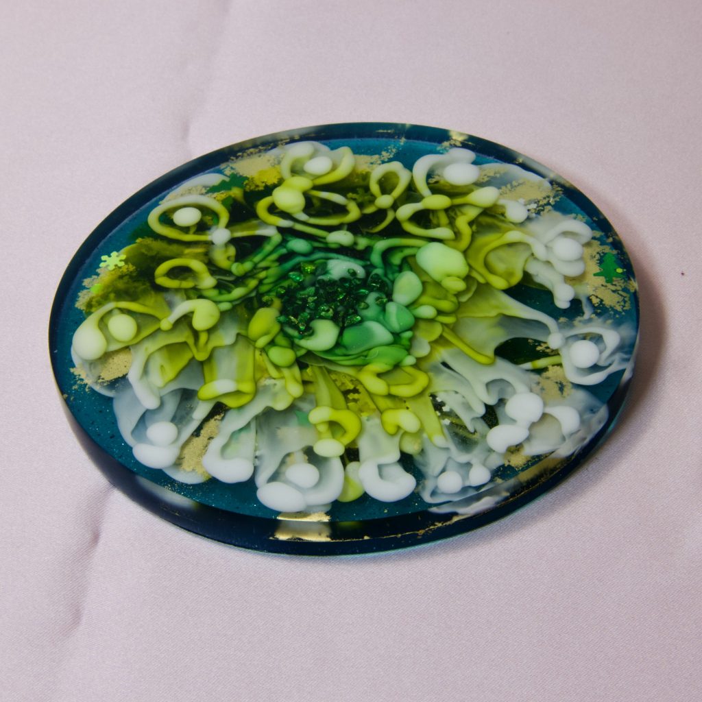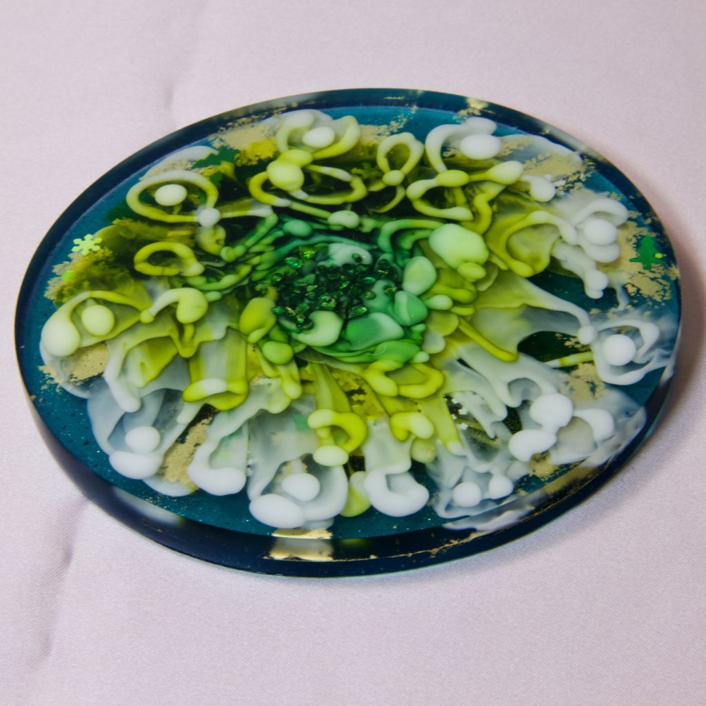 Sous-tasse ronde en résine – Dégradé de verts apaisants & pétales blanches envoûtantes