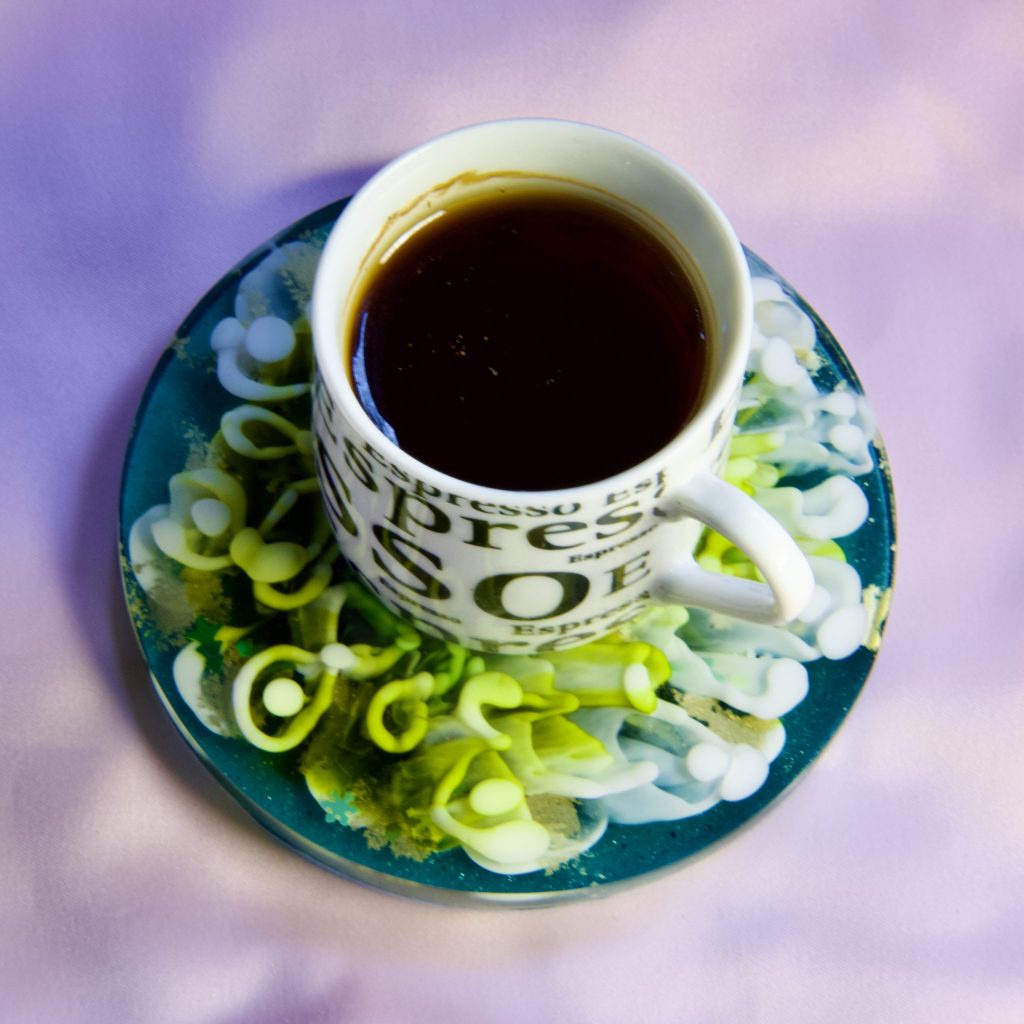 Plonge dans un écrin de sérénité avec cette sous-tasse en résine artisanale, où un dégradé de verts captivants rencontre la délicatesse de pétales blanches. Son fond vert azulado profond évoque la fraîcheur d’une forêt luxuriante, tandis que son cœur vert émeraude lumineux et ses touches de vert mojito pétillant insufflent une énergie douce et revitalisante. Une véritable invitation à l’évasion, parfaite pour embellir tes instants de détente.
